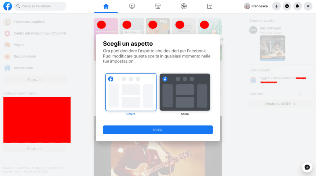 La seconda schermata che ci appare è un cambiamento che abbiamo già visto in molti smartphone e su Instagram, negli ultimi tempi (Twitter l’aveva già da molto più tempo questa opzione). Abbiamo la possibilità di scegliere lo sfondo: chiaro (come è sempre stato) o scuro (il facebook dark mode per far riposare un po’ i nostri occhi).