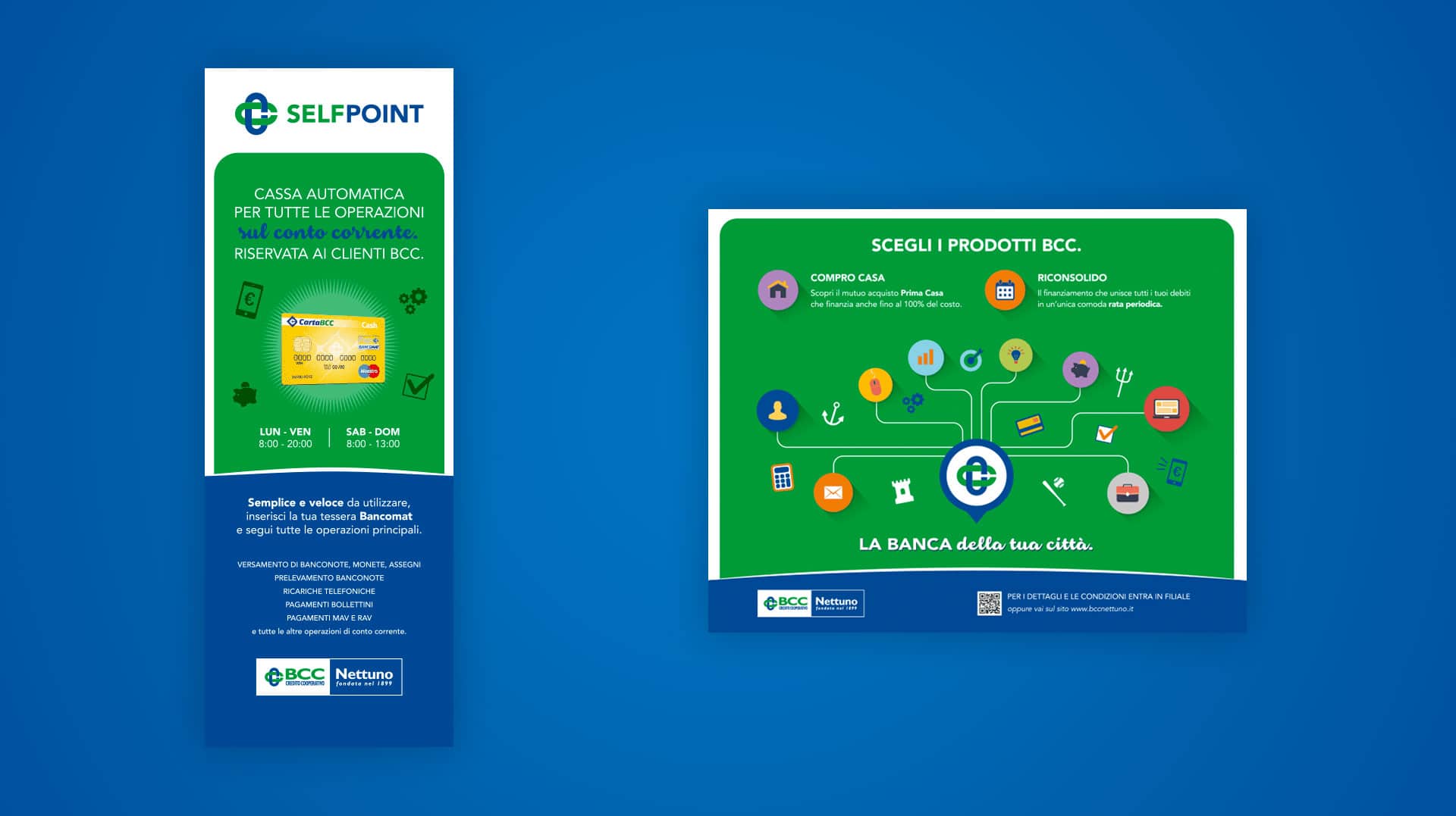 BCC Nettuno è una banca dalle forti fondamenta e dal fortissimo legame con la propria città, una banca che risponde ai cittadini concretamente e non per slogan. Nell’ottica di un mondo della comunicazione in continuo movimento ha incaricato Link ITB di pensare a un nuovo modo di parlare al proprio pubblico portando con sé i propri valori fondamentali. Link ITB ha iniziato dalla gestione delle vetrine della filiale che si trova nel cuore della città.